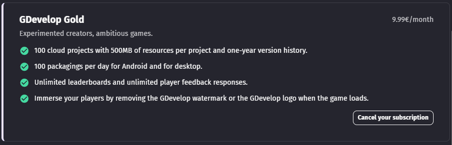 ✨ By taking a subscription you help the future development of GDevelop. Thank you for your support!